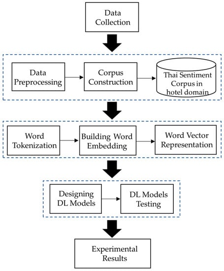 In this research, we propose a framework for the sentiment analysis of Thai hotel reviews using the Word2Vec technique, applying DL models for polarity classification. Figure 1 depicts the proposed framework including data collection, corpus construction, building word embedding, DL model design and evaluation, and experimental results.