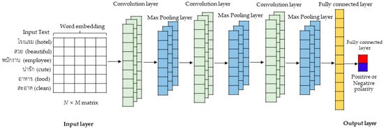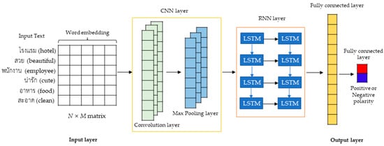In this research, we also developed hybrid DL models by combining CNN and RNN models (e.g., CNN-LSTM, CNN-BiLSTM, CNN-GRU, and CNN-BiGRU) to evaluate their performance in Thai sentiment analysis. Table 6 shows the hyperparameter values for the hybrid models. Figure 5 shows the overall structure of an example of a developed hybrid model combining CNN and LSTM with five main layers. The first layer was the input layer of word embedding generated with different vector dimensions. The second layer was the CNN model with 3–5 convolution layers, each assigned with the same number of units, a kernel size of 2, and the “ReLU” activation function, followed by two max-pooling layers with a dropout rate of 0.2. The third layer was the LSTM model applied to filter information from the CNN output, with a dropout rate of 0.2. Finally, two dense fully connected layers were applied for the product output in terms of sentiment polarity using the “ReLU” and “sigmoid” activation functions. We used the “adam” optimizer and “binary_crossentropy” loss function considering their suitability for binary classification.