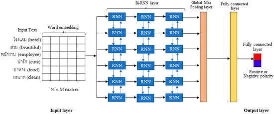 To evaluate the performance of the RNN and Bi-RNN models (LSTM, Bi-LSTM, GRU, and Bi-GRU), we evaluated the performance of 3–5 layers in sentiment classification. The specific hyperparameter values of the sentiment analysis models are shown in Table 5. For example, Figure 3 and Figure 4 depict the flow of the three-layer RNN and Bi-RNN models for sentiment classification, respectively. In the experimental step, the word embedding results were fed into the developed models (RNN and Bi-RNN). Each layer of the developed models had the same number of units, and the “return_sequences” parameter was set to true, while the dropout layer was set to 0.2. The global max pooling layer was applied to reduce the feature size according to the output of the previous layer.