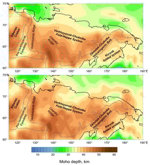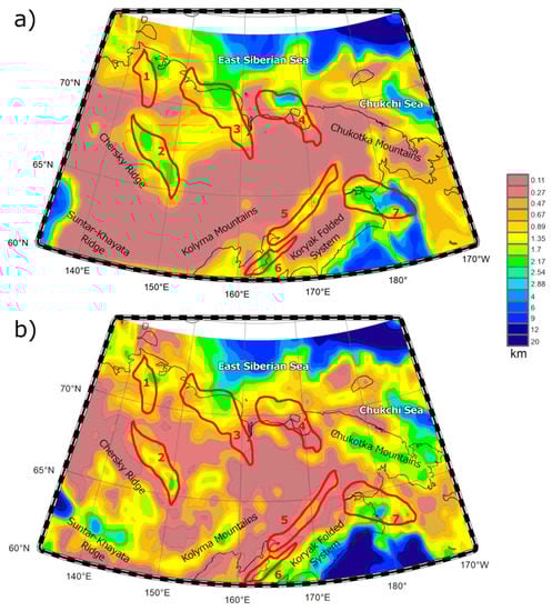 - For the Anadyr basin in its continental part, the thickness is reduced to 1–2 km compared to previous surveys. Although the thickness is higher in some very local depressions [44], which are not resolved by the new model, the northward decrease trend is visible for the continental part in both models, indicating that the new modeling approach provides sufficiently reliable results, at least qualitatively.