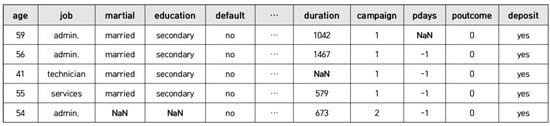 Example of an input dataset with incomplete tabular data. This is the Bank dataset used for performance evaluation in Section 6.