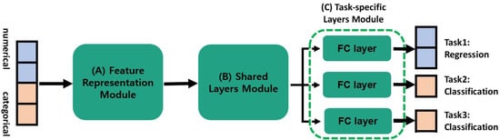 As mentioned above, the DSAN performs regression and classification tasks in parallel using MTL. Each task is a prediction appropriate for the type of variable. If the variable is numerical, the task is a regression; if the variable is categorical, the task is a classification. We used hard parameter sharing (the most common form of MTL); this reduces overfitting by sharing the hidden layers. The components output by the feature representation module are divided between the shared-layer and the task-specific layer modules.