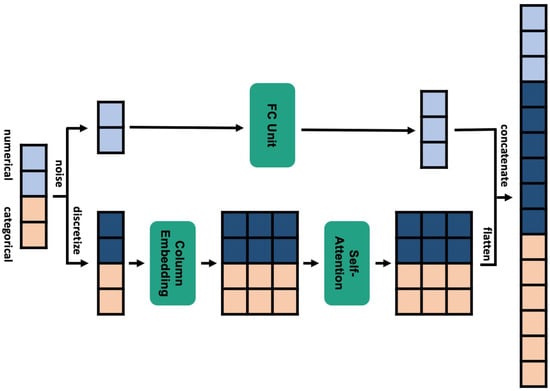 The attention mechanism employed in machine translation [] has been successfully ported to natural language processing tasks [,] and computer vision []. A number of attempts have been made to incorporate the mechanism into deep neural networks that handle tabular data. TabNet [] used an attention mechanism to imitate a decision tree, which works well when used to handle structured data. TabNet enabled interpretable and efficient learning; sequential attention was used to select the important features of each decision-making stage. TabTransformer [] used the encoder of a transformer [] and a self-attention mechanism to map categorical features into a contextual embedment. TabTransformer outperformed a multi-layer perceptron (MLP) and a tree-based ensemble model, and was very robust against noisy and missing data.