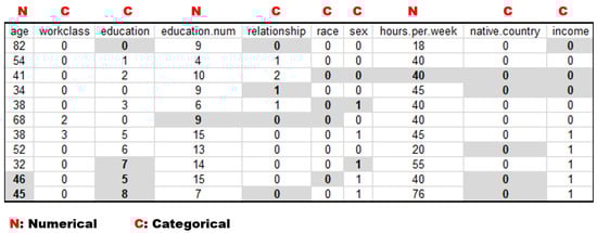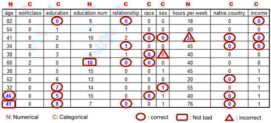 Figure 6 shows an example of performing imputation on the Adult dataset with the imputation model generated by the DSAN technique. Assuming that (categorical and numeric) values in the shaded cells in Figure 6 are missing according to the MCAR type, Figure 7 shows the result of imputing the missing values through the DSAN imputation model. As seen in the figure, most of missing values were replaced with correct values.