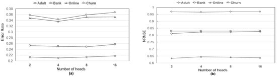 (a) Changes of error rate for categorical data imputation from varying the number of heads in the multi-head attention. (b) Changes of NRMSE for numeric data imputation from varying the number of heads in the multi-head attention.