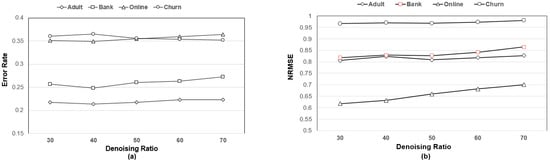 (a) Changes of error rate for categorical data imputation from varying the denoising ratio. (b) Changes of NRMSE for numeric data imputation from varying the denoising ratio.