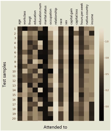 Self-attention weights of 20 records of the ‘sex:NULL’ feature when the `relationship’ variable had the ‘Husband’ value.