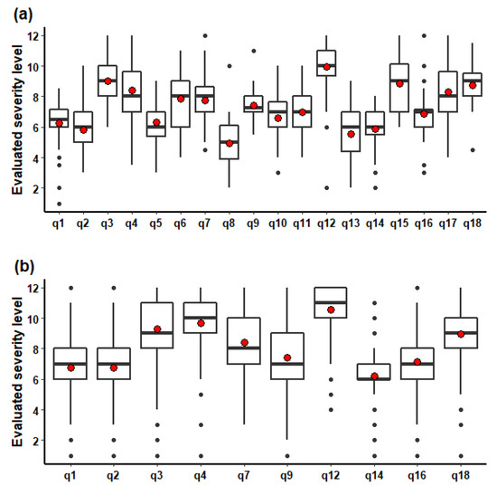 Boxplots presenting the distribution of replies to each question in the two datasets: (a) results of the questionnaire to 44 graduate students (Supplementary Materials File S2); (b) results of the online survey (Supplementary Materials File S2). The horizontal axis represents the questions (i.e., q1, q2, … qn), while the vertical axis shows the distribution of the answers according to the evaluated damage severity levels. Note that the lower image (b) shows fewer cases since the online survey included only 10 questions. The boxes represent the interquartile range (IQR, or the Q1–Q3 range) with a horizontal line denoting the median and a red circle representing the mean value (see also Table 1).