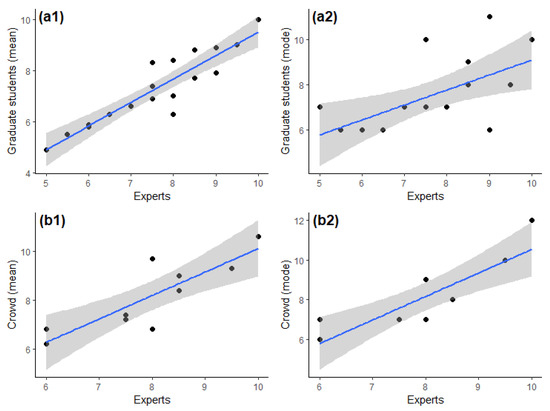 Correlations between the evaluations of the experts and the corresponding estimates made by the graduate students or the crowd: (a1) experts vs. graduate students’ mean severity level; (a2) experts vs. graduate students’ mode severity level; (b1) experts vs. the online crowd’s mean severity level; (b2) experts vs. the online crowd’s mode severity level.