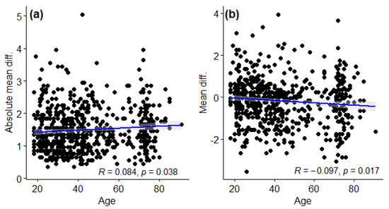 Scatter plot and correlation between the age of the online respondents and: (a) the absolute mean difference between their evaluation and the experts’ evaluation; (b) the mean difference between their evaluation and the experts’ evaluation.