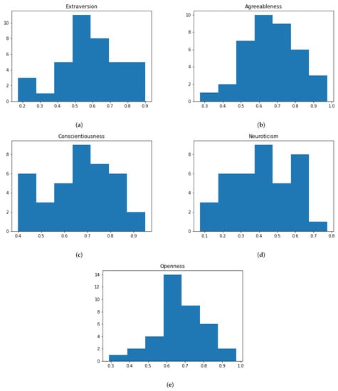 We give an exploratory analysis of the data in this section. An Intel Core i5 personal computer with a 1.6 GHz processor, 16 GB of Memory, and an MX130i GPU was used for the data analysis presented below. We applied basic statistical analysis to the dataset. We calculated histograms of the personality traits (see