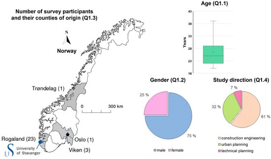 | Q1.1 Age (open answer) Q1.2 Gender (choose one: male, female, other) Q1.3 Which county are you from? (choose one: Rogaland, Agder, Innlandet, Møre and Romsdal, Nordland, Oslo, Vestfold and Telemark, Troms and Finnmark, Trøndelag, Vestland, Viken) Q1.4 Which is your BSc study direction? (choose one: construction engineering (1), urban planning (2), technical planning (3)) |