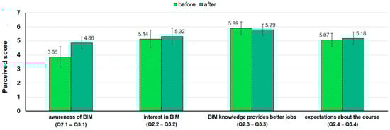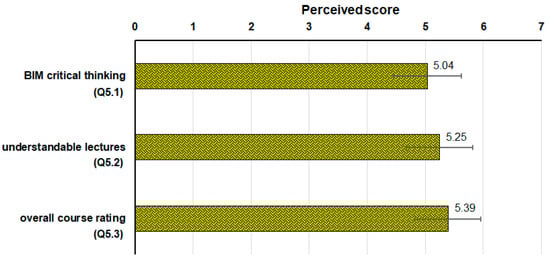 | Q5.1 Do you think that the teachers promoted critical thinking about BIM concepts? (choose one: extremely low, very low, low, average, high, very high, extremely high) Q5.2 Do you think that the topics lectured were fully understandable? (choose one: extremely low, very low, low, average, high, very high, extremely high) Q5.3 What is your overall rating of the course? (choose one: extremely low, very low, low, average, high, very high, extremely high) |