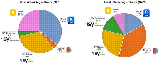 | Q4.1 Which software did you find most interesting? (choose one: Revit, Dynamo, ISY Calcus, ISY Beskrivelse, Solibri) Q4.2 Which software did you find least interesting? (choose one: Revit, Dynamo, ISY Calcus, ISY Beskrivelse, Solibri) Q4.3 Do you think that working with BIM software is easy? (choose one: extremely low, very low, low, average, high, very high, extremely high) Q4.4 Do you think that working with BIM software can enhance your creativity? (choose one: extremely low, very low, low, average, high, very high, extremely high) Q4.5 Do you desire to continue learning BIM in the future? (choose one: extremely low, very low, low, average, high, very high, extremely high) Q4.6 Do you think that BIM needs to be taught at university? (choose one: extremely low, very low, low, average, high, very high, extremely high) |