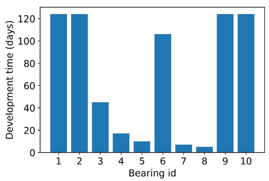 Ultimately, 11 different cases were identified, which are summarised in Table 2. For each case, we provide two datasets: one with a period of four months of normal data, called the training dataset, and one with a period of four months prior to the bearing being changed because of a defect, called the test dataset. An exception was made when data from less than four months were available before the change; in such cases, all available data were used. In addition, the last bearing (bearing 11) contained a fault that was not related to a bearing but was included as an example of external events being present, as described in Section 4.3. The period prior to the change of the bearing either contained both normal and faulty data or only faulty data, depending on the fault development. The normal data were collected after the change of the bearing to ensure that no fault was present in the bearing. For all datasets, when available, both the drive-side and free-side measurements were collected.