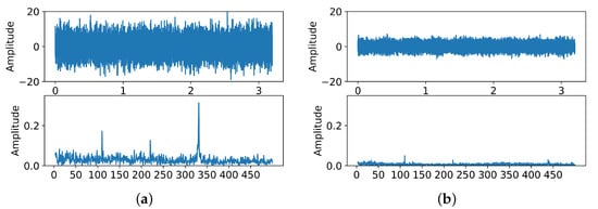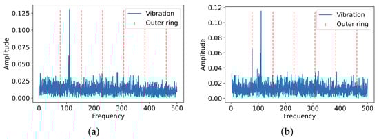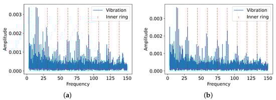 One aspect identified was the differences in the fault development time, as can be observed in Figure 1. This was analysed using the same method as the labelling procedure, that is, the enveloped frequency spectrum constructed by the Hilbert transform and FFT. In most cases, the development was slow, meaning that no apparent changes in the damage were seen during the last few months before the change of the bearing, such as the fault in bearing 1. Figure 2a shows the data from the first reading of the test dataset, and Figure 2b shows the last reading from the test dataset. As can be seen, there were no apparent differences in the data.