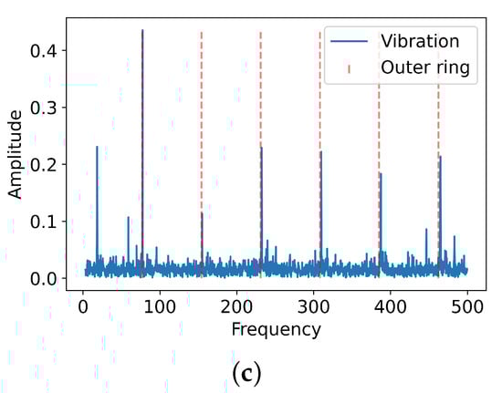 However, in other cases, such as bearing 8, the fault developed quickly and progressed from no damage to severe damage in a matter of days before it was changed. This can be observed in Figure 3. Figure 3a shows the measurements taken around 7 days before the bearing was changed. As can be seen, no clear fault can be seen in the data. Figure 3b illustrates the measurements taken around 6 days prior to the change, and the initial signs of an outer fault can be observed. Lastly, Figure 3c shows the last measurements taken before the change, and at that time, clear signs of an outer fault are visible. The significant differences in the fault development time among the different cases highlight the challenge of predicting the remaining useful life of bearings in an industrial environment.