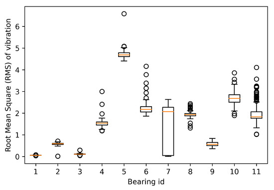 Another aspect identified by inspecting the different cases was the variations in operating conditions. These conditions encompass the differences in the load and rotating speed of the shaft, which have been considered in the currently available datasets [12,14,21], as well as noise. Firstly, the rotation speed ranged from slow rotation to fast rotation, and from fixed speed to varying speed, which can be seen in Figure 4. In terms of analysing the variations in the noise and load, since the actual levels were unknown, we used the root mean square (RMS) value of the normal data for the different cases as an indicator. We used this measurement because it can provide an overview of the amplitude of the vibration signal [23]. As shown in Figure 5, there were variations in the amplitude of the vibration signal among the bearings, which can be attributed in part to the different loads and noise levels.