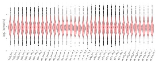 Initial quality control analysis revealed high-quality samples with stable protein expression distribution across all samples in each of the experiments (Figure 1) with the median value for log2-intensities equal to 29.5 (27.5–31.5) across all samples. The total ion chromatograms (TIC) for all experiments are shown in Figure S1.