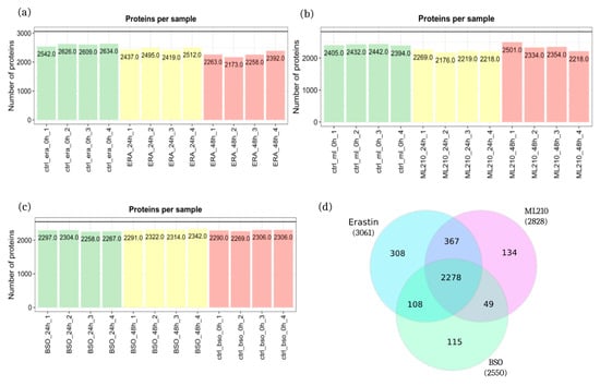 Proteome data overview. (a) Number of detected proteins across biological replicates in the erastin experiment. (b) Number of detected proteins across biological replicates in the ML210 experiment. (c) Number of detected proteins across biological replicates in the BSO experiment. (d) Overlapping of the detected proteins across experiments. ctrl—control; ml—ML210; ERA—erastin. Numbers correspond to the biological replicates.