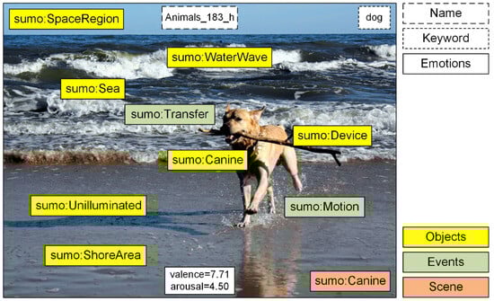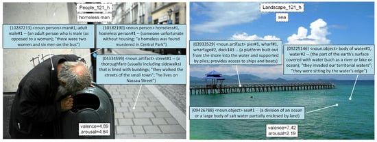 Semantic enrichment of a dataset involves adding additional information to the dataset that helps to describe and contextualize the content better []. The semantic enrichment process aims to make the dataset more useful for analysis, search, and information retrieval by improving its ability to be understood by humans and machines []. Typically, this includes adding free-text labels, tags, or differently structured metadata that give additional meaning to the data. However, semantic enrichment can be further improved by linking data from knowledge taxonomies or ontologies, either specialized for specific domains or describing general knowledge []. In this paper, we used the WordNet lexical knowledge graph [,] and general, shared, and reusable ontology SUMO [] containing formally described concepts as the vocabularies for the labeling of entities and stimuli semantic enrichment. Our approach is explained in detail in Section 2.1 and Section 2.2. An example of a thorough semantic enrichment of a NAPS visual stimulus using SUMO formal concepts is illustrated in Figure 1.