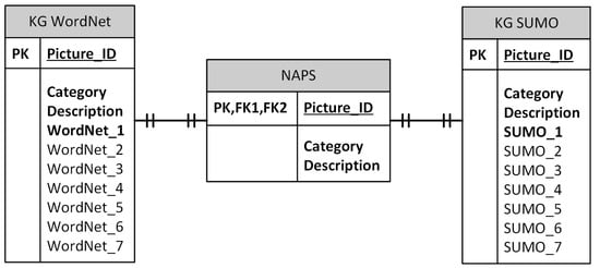 Integration of the KG dataset (WordNet and SUMO) with the NAPS database can be accomplished by utilizing the ‘Picture_ID’ attribute as the foreign key with 1:1 relationship cardinality. This approach semantically enriches the original NAPS attribute ‘Description’ with 14 KG attributes.