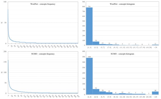 The numbers of WordNet synsets and SUMO concepts used to semantically describe each picture are very similar in the presented dataset. This can be attributed to the usage of mappings, which effectively connect each synset to a related concept. However, it is important to consider that the overall number of distinct ontology concepts is much lower than the entire number of unique synsets. This is primarily due to the fact that within the ontology, multiple synsets have been allocated to identical or subsuming concepts. This mapping technique contributes to the simplification and consolidation of the semantic representation of pictures, resulting in a more compact and coherent ontology-based description.