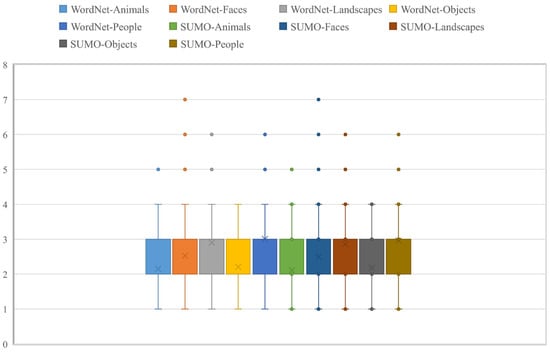 Box-and-whisker diagrams showing the distribution of WordNet and SUMO entities for description of each picture in five categories: Animals, Faces, Landscapes, Objects, and People.