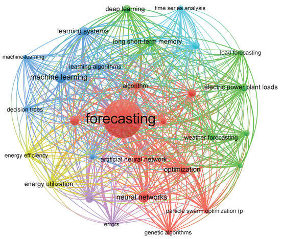The importance of energy forecasting is underscored by the myriad of challenges faced by modern electrical systems, ranging from demand–supply imbalances to the integration of renewable energy sources. Adaptive techniques, which leverage advanced algorithms and methodologies, promise dynamic and responsive forecasting models that can adjust to changing conditions and deliver accurate predictions. An analysis from Scopus based on forecasting techniques from 2015 by considering only high-impact journal publications shows the different keywords associated with forecasting researchers and how these topics are related; this can be seen in Figure 1.