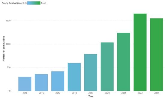 In the period spanning from 2015 to 2023, there was a significant upward trend in scholarly publications, according to a comprehensive analysis. The research output started with a modest 299 publications in 2015, but there was a consistent annual increase, reaching a peak of 1647 publications in 2022. This represents a remarkable five-fold growth over just seven years. The year 2023 witnessed a slight dip with 1547 publications. However, this analysis was performed in October 2023, so there is the possibility that this number will increase. The scholarly output surge reflects the field’s dynamism and suggests a promising trajectory for future academic endeavors. This trend can be fully seen in Figure 3.