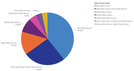 These diverse open-access models highlight the multifaceted strategies adopted by the academic community. It is a testament to the evolving nature of research dissemination, aiming to cater to both the researchers’ need for visibility and the public’s right to access. A detailed analysis of open-access vs. non-open-access publications is shown in Figure 5, in this figure around 4% of the analyzed articles were not classified and included in the figure because the type of publication access was not well stated.