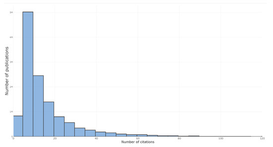 After a thorough analysis, it is clear that some publications have much higher citation counts than others. However, many publications have not been cited, which was possibly due to factors such as the research’s originality, the topic’s pertinence, or the publication’s visibility. Furthermore, the fact that only a quarter of the publications have citation counts above the average highlights the cutthroat nature of academic publishing and the importance of producing impactful research. A histogram showing the number of papers citations distribution is shown in Figure 6.