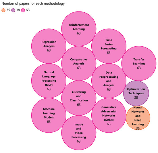 Energy, load, and electricity consumption is a research field that has employed a variety of methodologies to tackle different challenges and explore new frontiers. Sixteen predominant methodologies were identified in the literature review that this paper focuses its efforts on, as shown in Figure 7. These methodologies range from advanced machine learning techniques, including LSTM-based approaches and Generative Adversarial Networks (GANs), to more traditional methods, such as regression analysis and optimization techniques. Each methodology offers unique advantages and is suited for specific types of tasks.