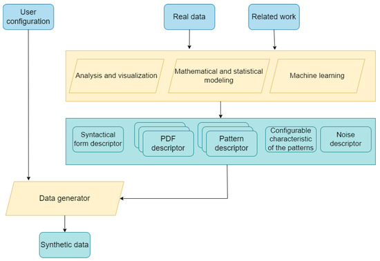 All of the above real-world data descriptors, together with other descriptors that might be needed (depending on the nature of the data that are being simulated), should be embedded in the last processing phase of the synthetic data generation—the data generator.