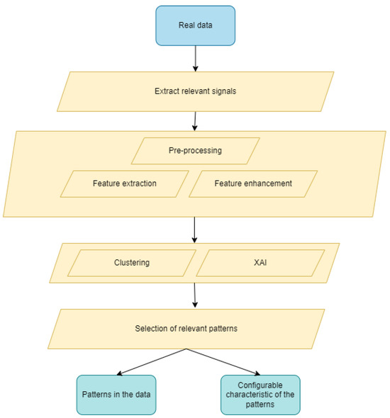 Figure 1. The methodology consists of different processing steps (represented with yellow in the schema) applied on inputs such as the real-world data, the results of other processing steps, or user configurations. The green-colored schema boxes represent the results of a processing step defined by the methodology and the blue-colored boxes represent the input for the overall methodology.