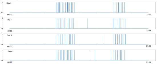 Figure 11, a snapshot of four days from the generated synthetic data is given. The snapshot contains the events of the user interaction (consisting of events of type start/end of the interaction with the smart device) recorded for four days.