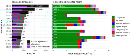 Thuja plicata Donn ex D. Don) occur throughout the forest. Trees on the Elliott Forest therefore exhibit a broad range of growth responses to different stand structures. These responses are recorded implicitly through timber cruising’s measurements of height–diameter relationships, stem taper, amount of live foliage, injuries sustained, stand composition, and stand density. The timber cruise’s individual tree measurements also capture limits to height growth that may not be accessible in datasets limited to trees younger than 100 years old.