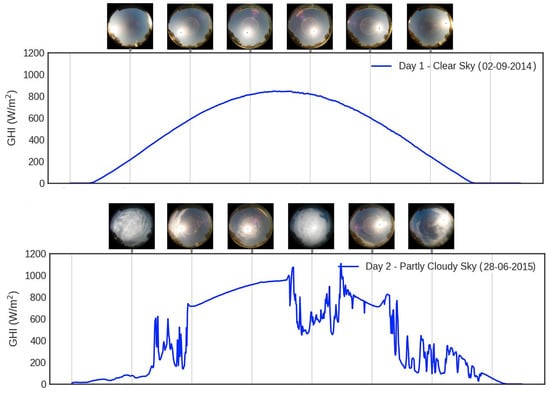 Samples of all-sky images and respective GHI values for two days. Adapted from [27].