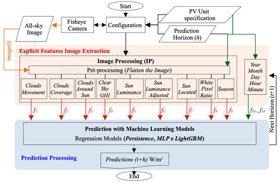The hybrid prediction approach proposed in [25] is depicted in Figure 2. A set of nine features (measurements) (f1 to f9) was calculated from each all-sky image using image processing techniques. In addition, another five features (f10 to f14) relating to temporal data and the climatic season form part of the inputs calculated from the images. This set of fourteen features for each all-sky image was then used as input for short-term predictions in the HPM using machine learning models previously trained on historical data [25,27].