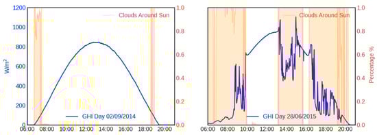 To demonstrate the image processing applied to each feature collected from all-sky images, two days with different weather conditions and GHI were selected, as shown in Figure 1. Considering all-sky image pre-processing, the following sections present processing details for the following features: Preprocessing, Clouds Movement (), Clouds Coverage (), Clouds Around Sun (), Clear Sky GHI (), Sun Luminance (), Sun Luminance Adjusted (), Sun Located (), White Pixels Rate (), and Season ().