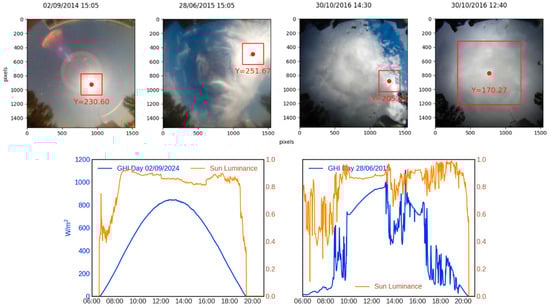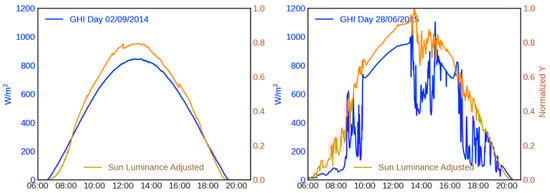 where is the clear sky GHI irradiance value at time provided by the Ineichen–Perez synthetic model, and is the maximum daily clear sky irradiance value. Finally, considering the luminance value calculated for the image taken at hour h and minute , the adjusted sun luminance value () is computed using the equation . Figure 10 shows examples of the Sun Luminance Adjusted feature; their values in the generated dataset are in the “fitLuminanceCSI” column.