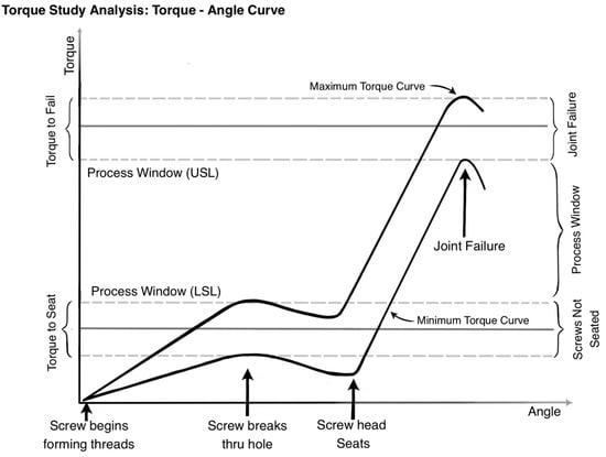 Similar steps can be observed in [,]. Due the torque study is to measure the torque-to-seat and torque-to-fail values. The equipment should be adjusted to apply torque to the screws until it exceeds the joint’s failure point, typically resulting in a stripped screw or a broken fastener.