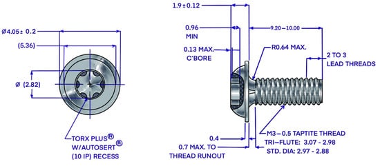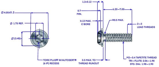 Torque tests were conducted on two screw types: M2 screws and M3 screws. The head dimensions conform to the Torx Plus round washer head specifications and Autosert requirements. The material follows the DIN 7500-1 [] or JIS B 1060 [] standards, and the screws feature a zinc plating finish. Figure 3 and Figure 4 illustrate the dimensions for each screw type.
