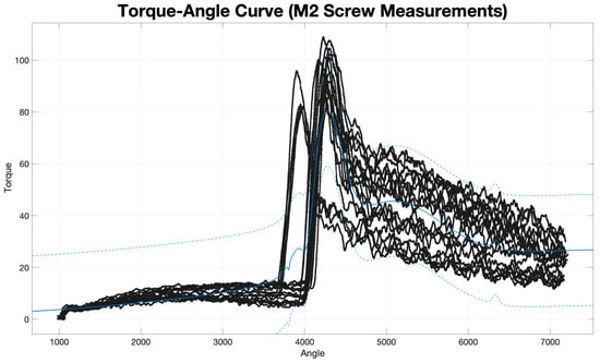 Torque–angle curves are essential for ensuring reliable assembly and optimal performance in engineering applications, particularly in the automotive industry. These curves graphically represent the relationship between the torque applied to a fastener and the angle of rotation, offering a precise method for achieving accurate tightening. By utilizing torque–angle curves, engineers can fine-tune the tightening process to avoid over-tightening, which could lead to material deformation, or under-tightening, which could result in loose or misaligned components []. This method enhances the consistency of the assembly process, reducing variability caused by differences in friction and material properties. Moreover, torque–angle curves help in optimizing fastener design and tightening procedures during the design phase, leading to improved component performance and durability []. In manufacturing, they serve as a critical quality control tool, ensuring that each fastener is tightened within the optimal range, thereby maintaining high standards of product reliability [].