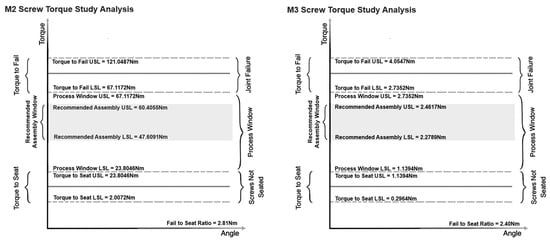 Since the USL represents the point where the screw joint begins to fail, and the LSL represents the point where screws may not be fully seated, a fail-to-seat ratio can be calculated using the Equation (5). This ratio serves as a predictor of screw joint robustness, which are obtained from fail-to-seat studies, manufacturing assembly data [] and from the experience of automotive industries: