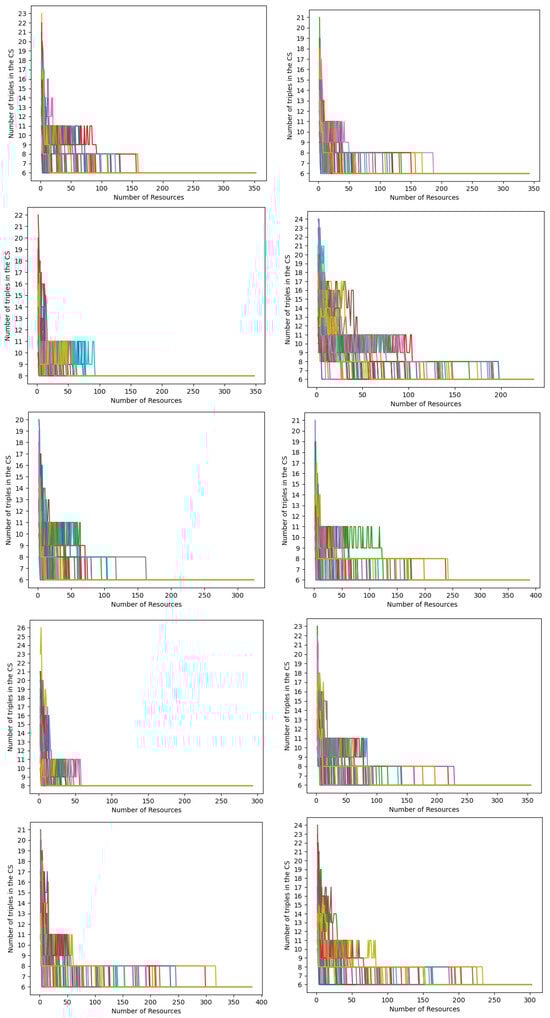 The chart includes 100 lines, which all converge to a number of triples in the CS that is equal to 0. Intuitively, no logical convergence needs to be proved here. In this experiment, the convergence rate varies a lot in the 100 tests: some tests rapidly reach the final empty set, while others analyze almost all resources in the set (see the orange line in Figure A1, converging at resource 1323, as an example).