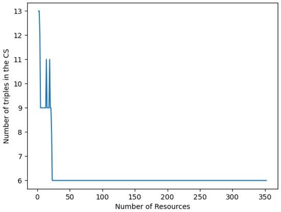 For the sake of visibility, in Figure 3, we show only one line of Figure 1 (referring to Cluster 1); all other lines showed a similar behavior. The reader may notice that the initial size of the CS is 13: the set describing the commonalities of the first two resources includes 13 triples. By adding resources to the computation, the size of the CS may decrease, increase, or remain constant. Generally speaking, the final number of triples (six in the case of Cluster 1) is reached by adding resources (convergence to six is reached at 23 resources in the test shown in Figure 3): the larger the collection, the smaller the number of shared features, in most cases. Nevertheless, the CS size may also increase with the number of resources: sometimes the addition of one more resource to the computation causes . In Figure 3, this happens twice: and . This phenomenon highlights a failure in the idea that the more resources are used, the fewer commonalities they will have, hence decreasing the size of the CSe For the resources presented in RDF, there is also the commonality when a se of ℓ resources achieves the same literal value, say v, through the same path, so that contains that path. If the next resource reaches v too, but through a different path, then might require more blank nodes (and more triples) to represent the different ways in which v is reached.