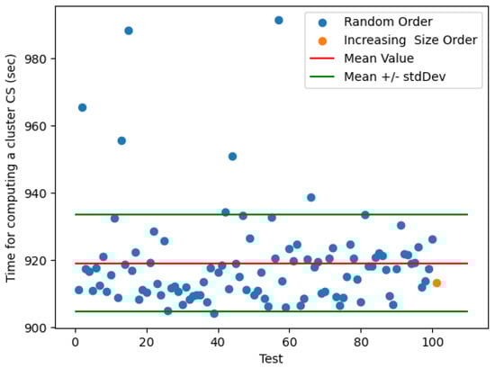 Figure 4 plots the runtime required to compute the CS of Cluster 3 in all 100 orderings considered in the experiments, shown in blue. We show Cluster 3 as a worst-case scenario, because it is the one with the highest mean runtime value (around 935 s). We treated the test in which resources are ordered in increasing size order (in orange) as a special case. Figure 4 also reports the lines for the mean value (red line) plus/minus the standard deviation (green lines), showing that only a small number of tests fall outside this range . The distribution is heavy-tailed according to statistics terminology, in the sense that most of the outliers (i.e., runtimes outside ) are much bigger than .