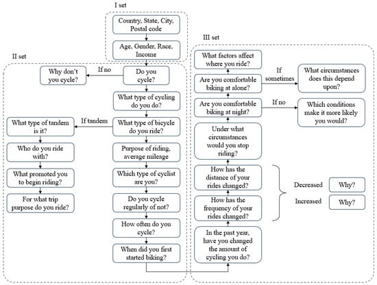 Set II: Questions such as the type of bicycle used, purpose of travel, mileage, and frequency of cycling.