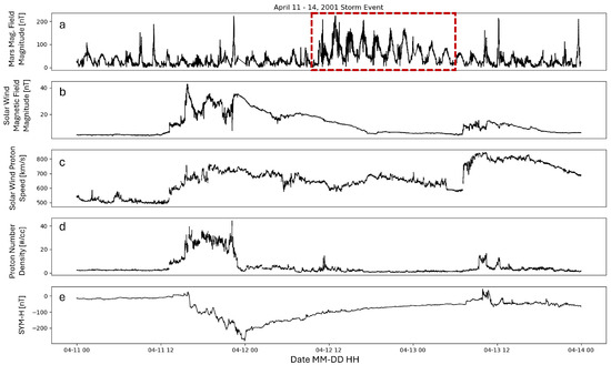 The observed disturbances in the solar wind were related to a halo coronal mass ejection (CME), which was detected on 10 April 2001 at 05:30 UT [36]. The solar storm was previously investigated and an interplanetary shock was identified in ACE data on 11 April at 15:27 (e.g., [37,38,39]). The interplanetary CME (ICME) was observed from 11 April 22:00–13 April 07:00 [36]. The geomagnetic disturbance index SYM-H reached a minimum value of nT as observed from Earth’s orbit. This minimum can be used as an indication of the beginning of the recovery phase. The high speed of the solar wind led to a Mars impact on 12 April at approximately 12:00 UTC. The MGS MAG data show the effects of the solar storm at altitudes ∼360–425 km, with a maximum magnetic field magnitude of around 225 nT. Figure 1 shows the magnetic field magnitude from MGS, the solar wind magnetic field magnitude, the solar wind proton speed, and the proton number density from ACE, and SYM-H from OMNI. The periodic increases in magnitude observed in the MGS MAG data show the spacecraft getting closer to periapsis approximately once every two hours, while the overall enhancement shown within the dashed red rectangle is related to the solar storm. The average magnetic field magnitude from 11 April at 00:12:21 to 12 April at 10:11:02 was 27.14 nT, while the average from 12 April at 10:11:03 to 12 April at 15:00:20 was more than double at 58.82 nT.